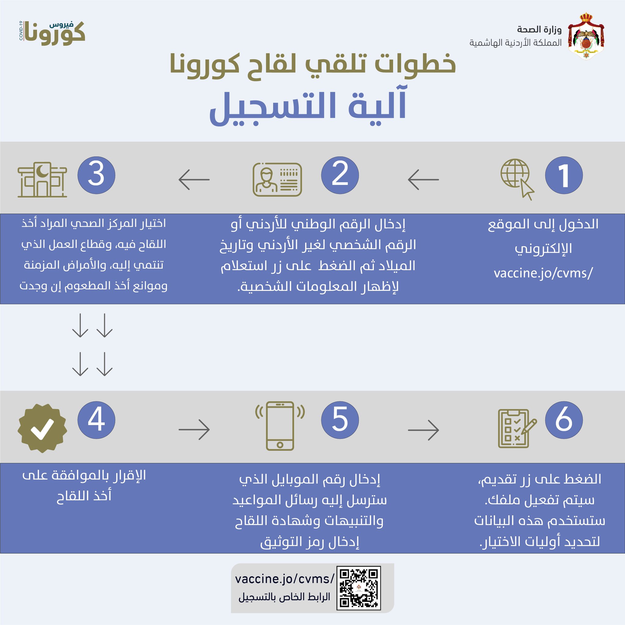 رابط التسجيل للحصول على مطعوم لقاح كورونا في الأردن من موقع وزارة الصحة الأردنية التي أعلنت أن خطوات تسجيل الأردني تبدأ بكتابة الرقم الوطني وقطاع العمل واسم المحافظة والأمراض التي يعاني. أعلنت وزارة الصحة مساء الاثنين اسماء مراكز التطعيم التي يتوافر فيها المطاعيم حسب نوع المطعوم وعدد الجرعات ليوم الثلاثاء. موعد تلقي مطعوم كورونا في الأردن.